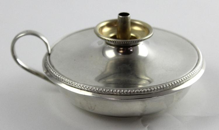 Lot 790 of 959: An early 20th century hallmarked silver table lighter with loop handle, diameter approx 9cm, assayed London, marks rubbed, approx 3ozt.