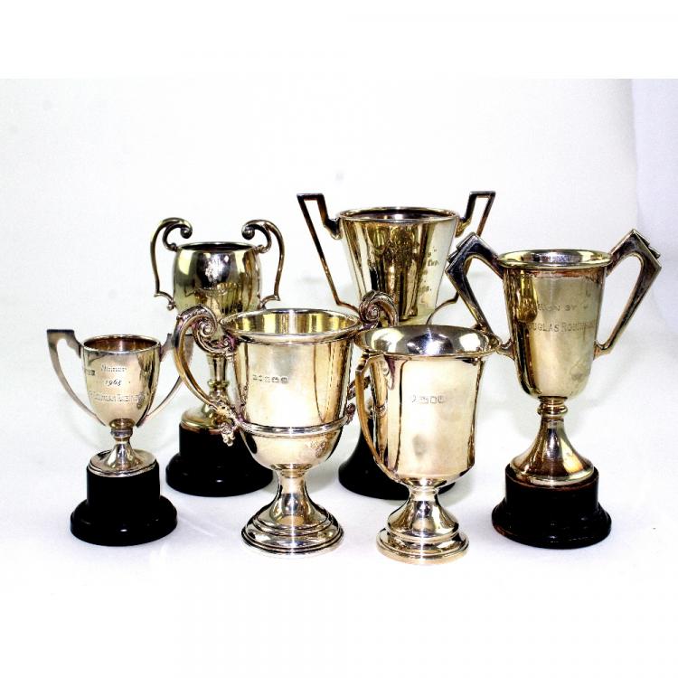 Lot 793 of 959: Three hallmarked silver twin-handled trophies of varying sizes, one golf-related, inscribed 'The 1960 Liverpool Golf Captain's Trophy', one inscribed 'Templars Ltd Mixed Doubles 1930 Won by S. Garland and Mrs R. G. Anderson' and one inscribed 'Replica of the Jaegar Retail Branch Trophy Lancaster 1950-1951', various hallmarks, combined approx 5.3ozt and three other silver-plated sporting trophies (6).