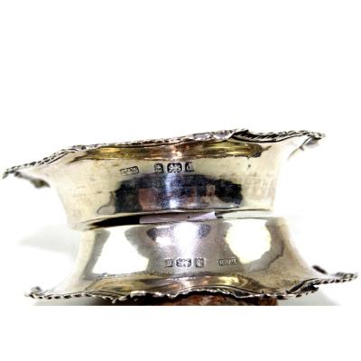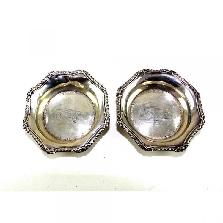 Lot 794 of 959: A pair of hallmarked silver pin dishes with scroll and bow decoration to the rim, marks rubbed (2).