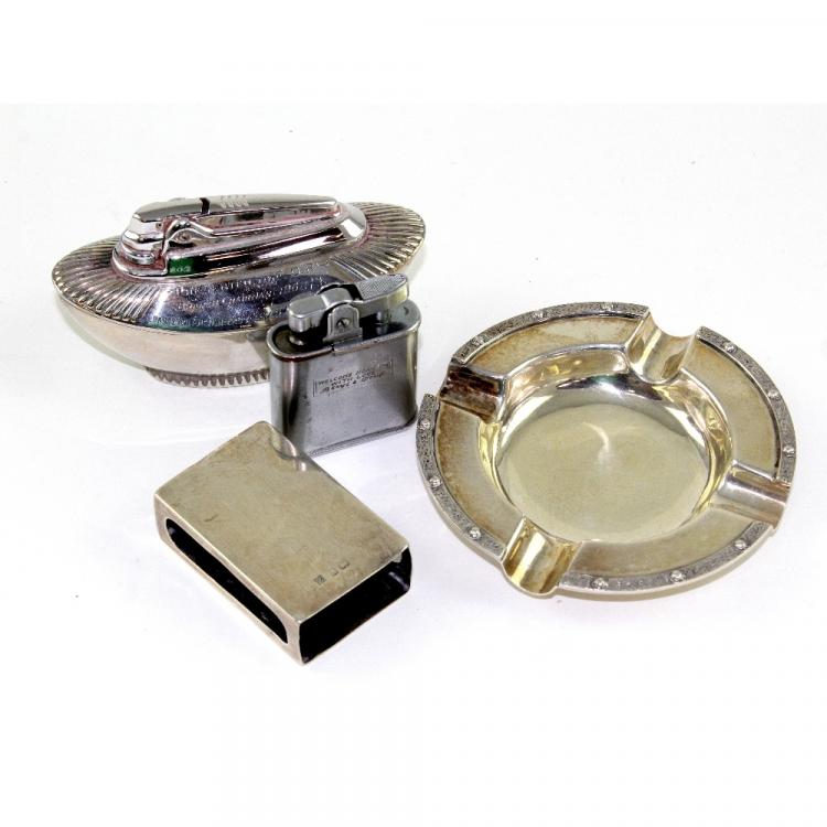 Lot 795 of 959: An Elizabeth II hallmarked silver ashtray with Celtic design rim, Dublin 1965, approx 2.6ozt, two vintage cigarette lighters, a Ronson table lighter and a Ronson 'Whirland' and a hallmarked silver match case with inscription to the corner of RAF wings and 'In Appreciation W.B.' (4).