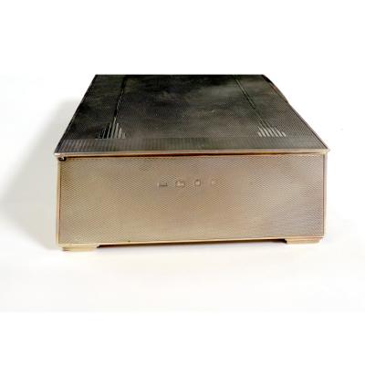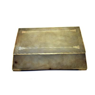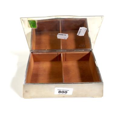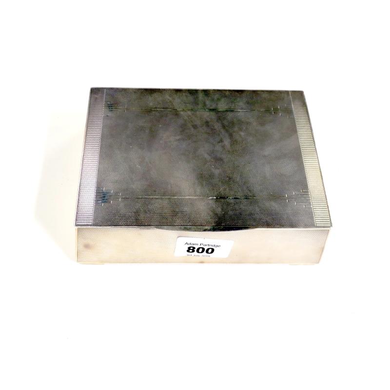 Lot 800 of 959: An Edward VII hallmarked silver Art Deco engine-turned cigarette box with twin-compartment wood liner, Walker & Hall, assayed 1909, length 16.5cm.