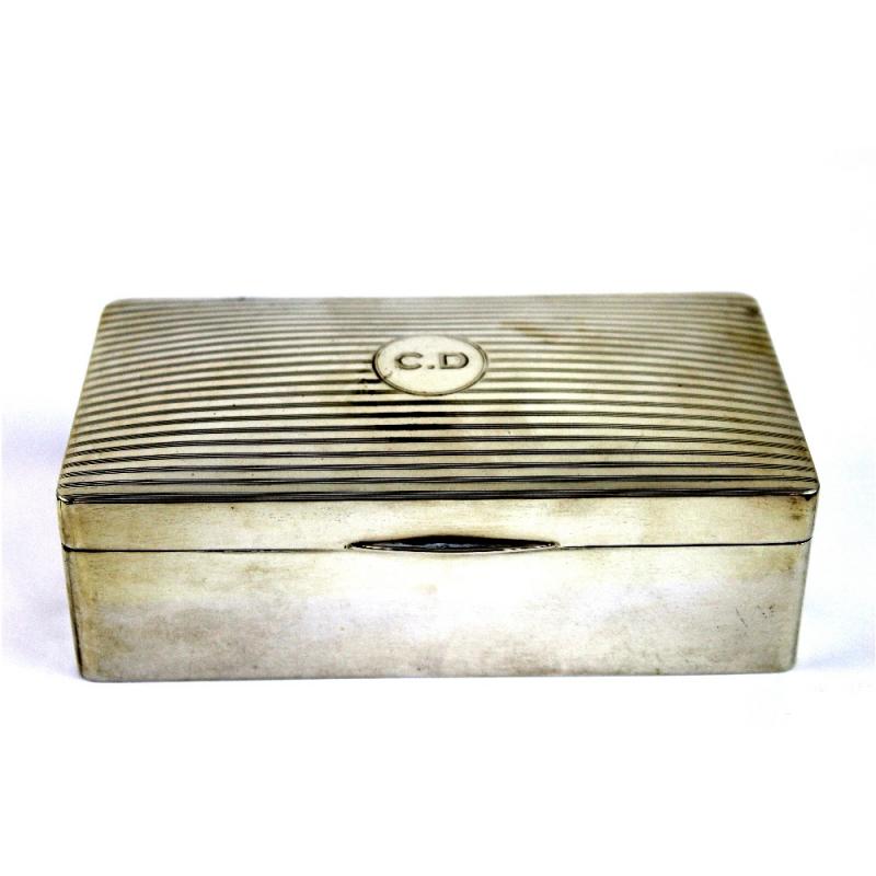 Lot 801 of 959: A hallmarked silver engine-turned cigarette box with central cartouche to the cover initialled 'C.D', marks rubbed, length 16cm.