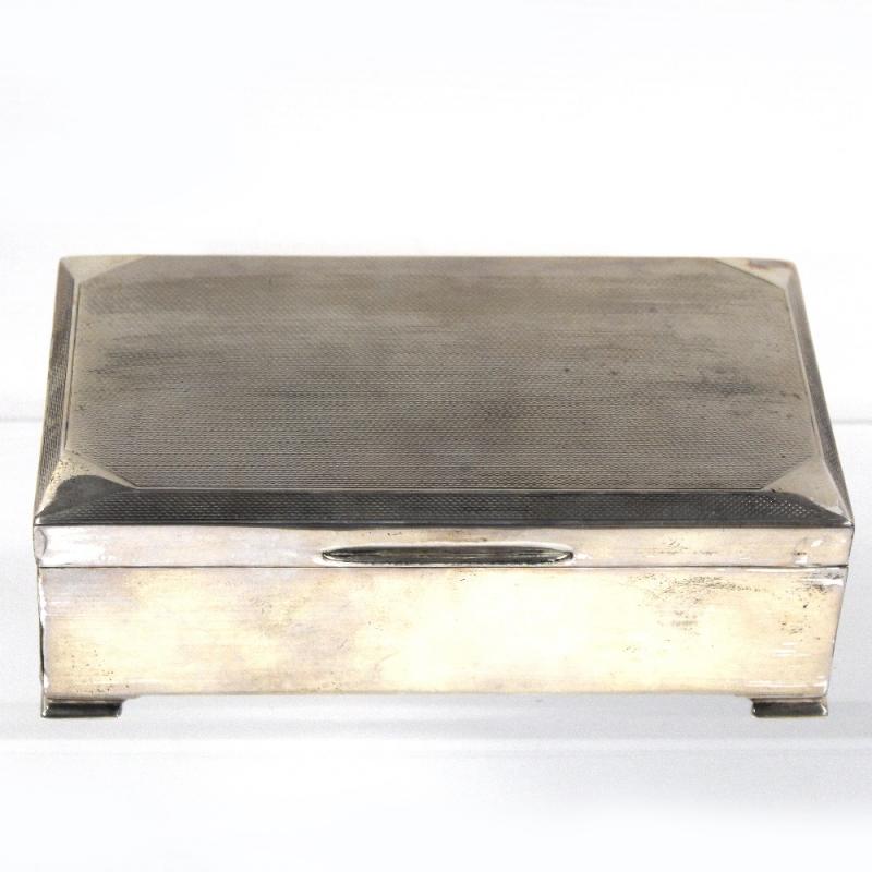 Lot 803 of 959: An Elizabeth II hallmarked silver engine-turned cigarette box with wood liner, Birmingham 1955, length 15.5cm.