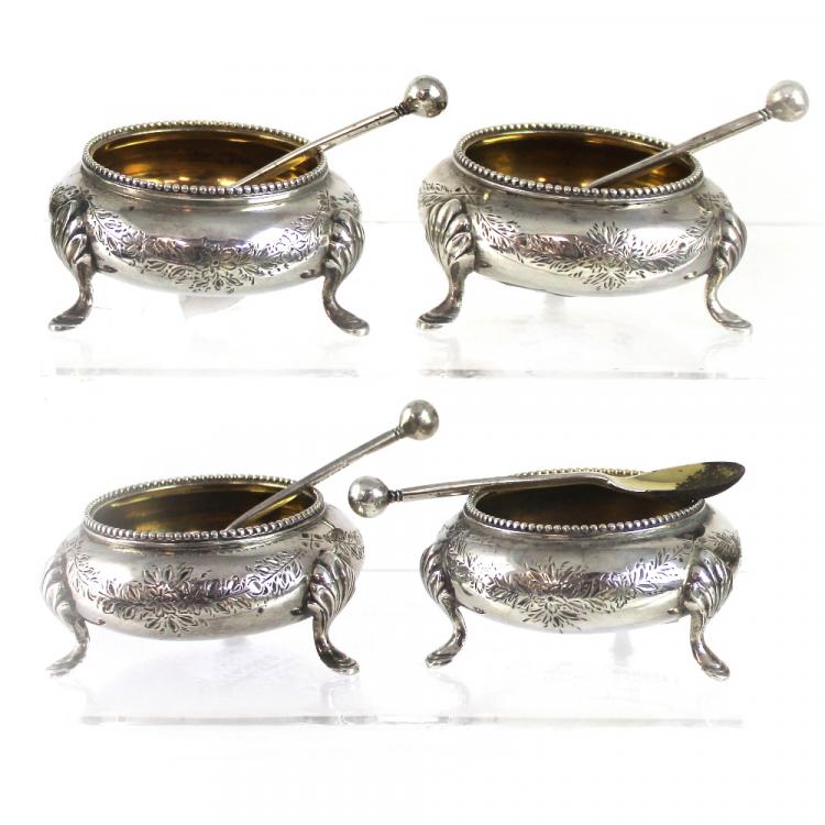Lot 808 of 959: A set of four Victorian hallmarked silver trench salts of three-legged cauldron form with bright-cut swagged decoration and lined in gilt, with set of matching spoons, London 1867, approx combined 9ozt (8).
