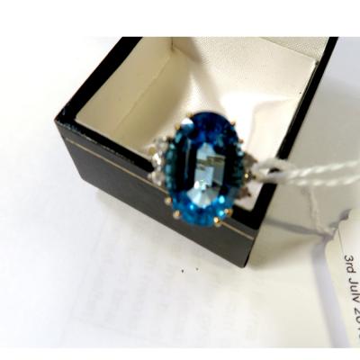 Lot 864 of 959: A 9ct gold chip diamond and large blue topaz dress ring, central stone approx 1.5cm, size P 1/2, approx 10g.