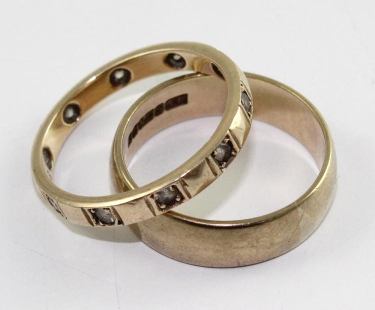 Lot 866 of 959: A 9ct gold ladies' wedding band, size J and a 9ct gold eternity ring set with small white stones, size K, combined approx 4.4g (2).