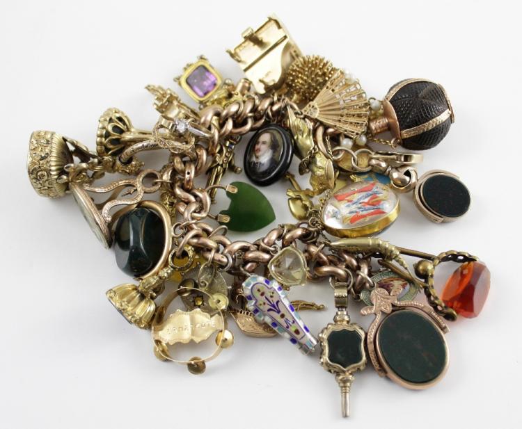 Lot 871 of 959: A huge and magnificent 9ct gold link bracelet suspending numerous 9ct, yellow metal and other charms to include fobs, seals, hedgehog, hearts, articulated fish, tambourine, jade padlock, 17th century sailing ships etc, approx 230g.