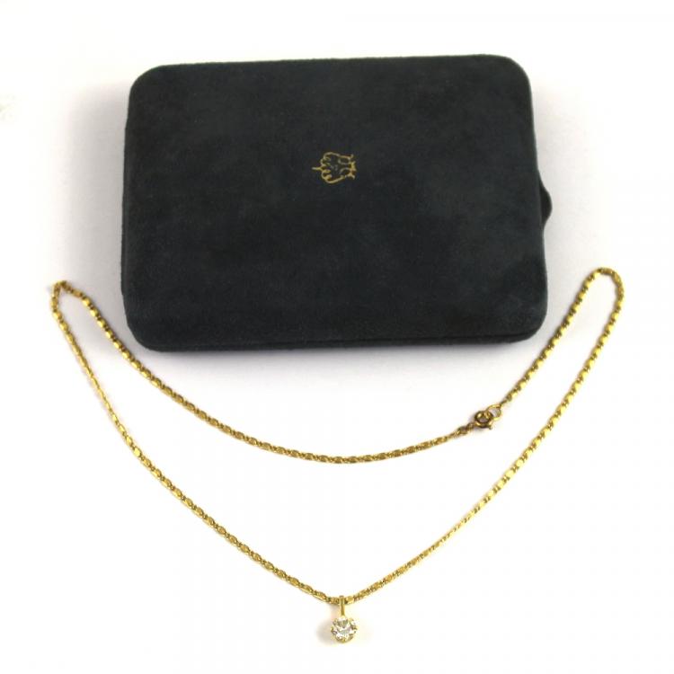 Lot 882 of 959: An 18ct gold mounted sixty-three point diamond solitaire pendant on fancy link chain, approx 5g.