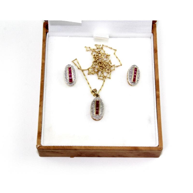 Lot 885 of 959: A 9ct gold link chain with a yellow and white gold oval pendant set with five baguette-cut rubies and diamond chip surround and a pair of matching stud earrings, combined approx 6.2g.
