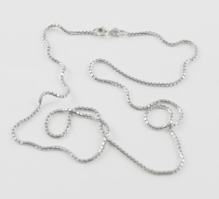 Lot 887 of 959: A 9ct white gold box chain necklace, approx 6.2g.