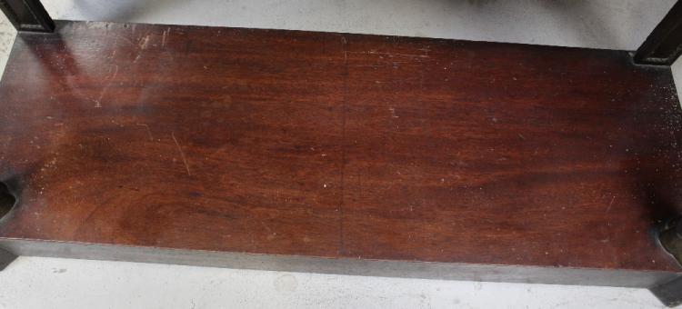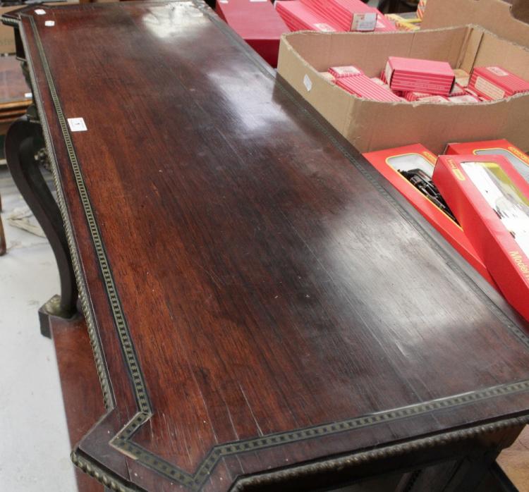 Lot 1 of 1098: A Regency period rosewood console table with brass inlaid band to top, ormolu rope edging and ormolu decoration of central palm branches with hawks to either side and Egyptian caryatid down-swept front supports ending in a pair of ormolu slender female feet, on a rectangular base, 93 x 117cm.