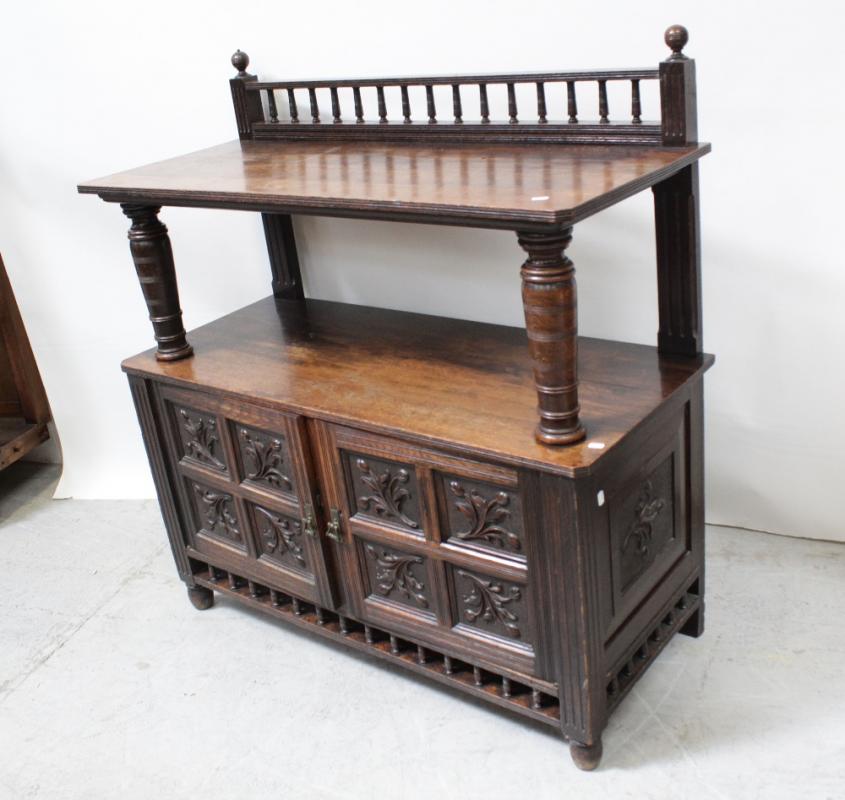 Lot 58 of 1098: A late Victorian oak buffet with bobbin-turned gallery back and with bulbous turned shelf supports surmounting a carved panelled twin-door base on turned bun feet, width 122.5cm.