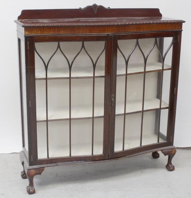 Lot 59 of 1098: An early/mid-20th century mahogany and stained beech serpentine front display cabinet with twin glazed doors and glazed sides supported on short cabriole legs to ball and claw feet, width 122cm.