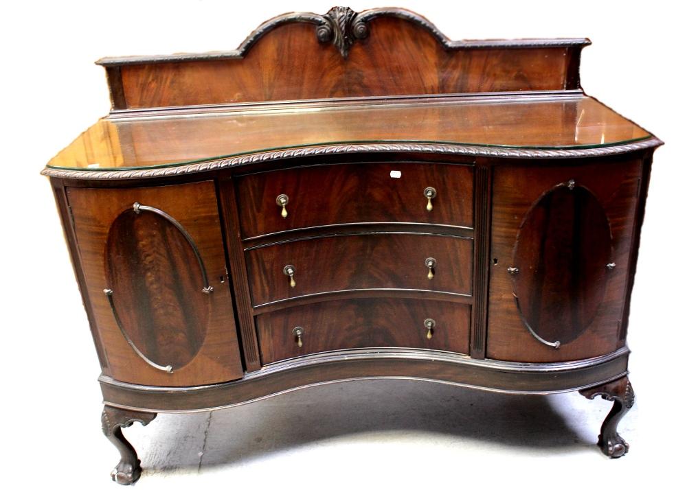 Lot 61 of 1098: An early/mid-20th century mahogany serpentine-front sideboard, curved back rail with acanthus leaf decoration to three drawers, cupboard door to either side, on cabriole supports and ball and claw feet, length 150cm.
