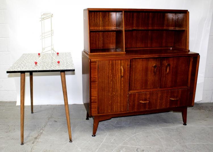 Lot 64 of 1098: A 1960s G-Plan sideboard, the upper section with adjustable shelves surmounts a three-cupboard and single-drawer base, height approx 130cm, a 1950s melamine-topped table on turned tapering legs and a white painted wirework shoe rack (3).