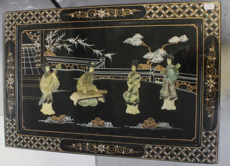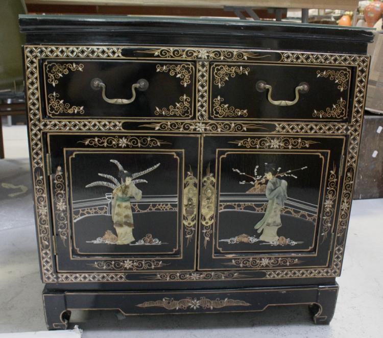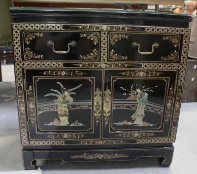 Lot 65 of 1098: An Oriental black lacquer style side cabinet with applied shallow relief figures to a painted backdrop, the glass top surmounts a two-drawer and two-cupboard base on Oriental bracket feet, height approx. 62cm.