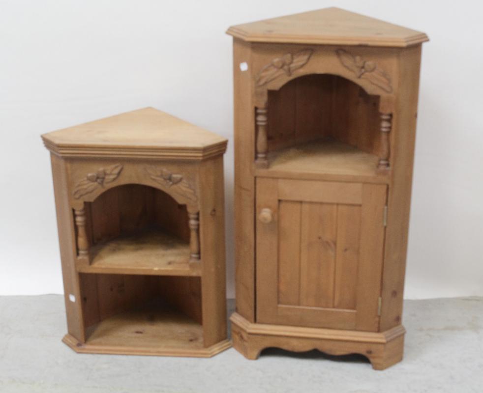 Lot 68 of 1098: A small modern oak pine two-section corner cupboard, the open elevated section surmounting a base unit with upper well and lower cupboard door, overall height approx 150cm.