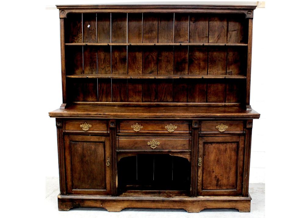 Lot 70 of 1098: A large Edwardian oak dresser, the three frieze drawers surmount a single drawer and central well flanked by two cupboards beneath an elevated Delft rack, width 192.5cm.