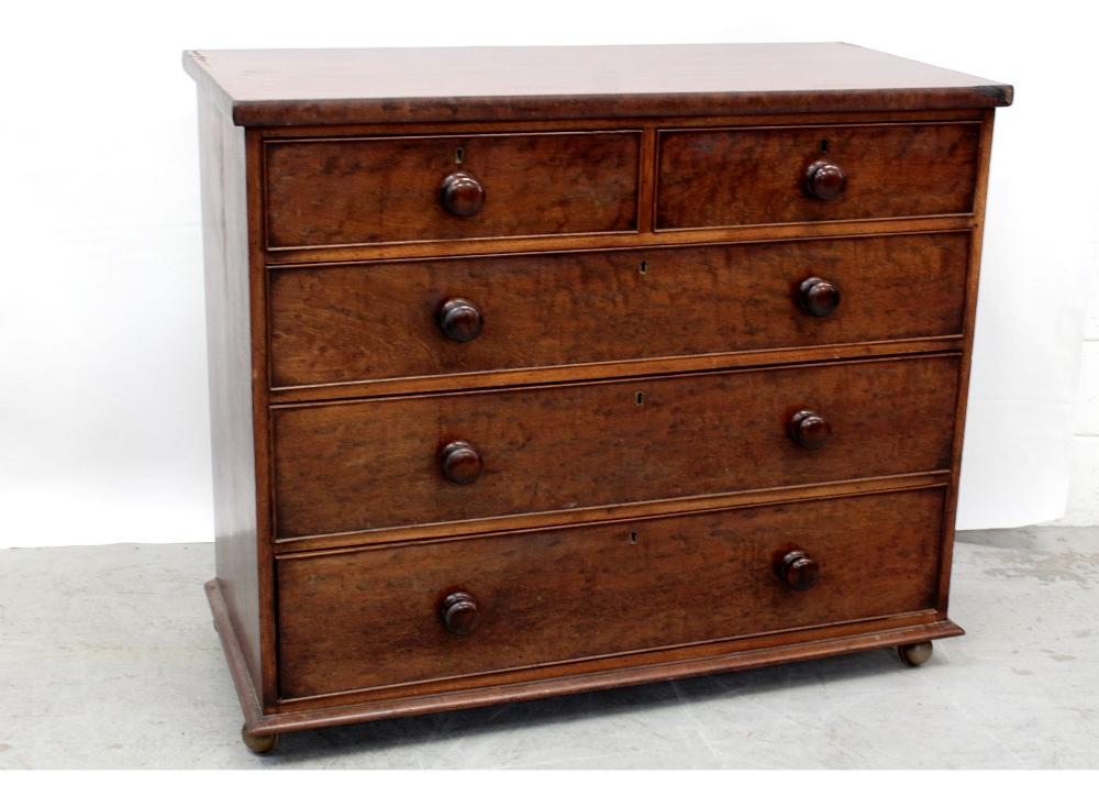 Lot 78 of 1098: A George III plum pudding mahogany chest of two-over-three drawers with knob handles, lacking bracket feet but with castors, width 116cm.