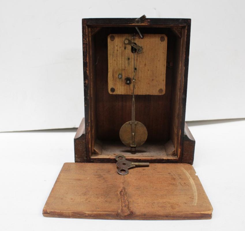 Lot 170 of 1098: A Biedermeyer walnut mantel clock of rectangular form, the Roman dial with single aperture to single-train movement surmounting a moulded socle base, height 23cm and a late 19th century brass carriage, the white enamel dial set with Roman numerals and with dedication to the lower plinth dated 1882 (af) (2).