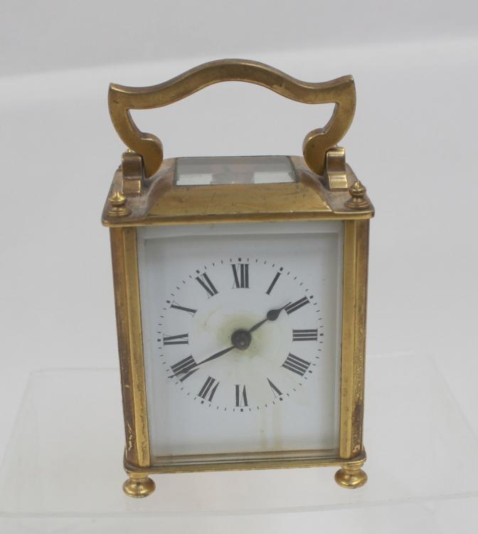 Lot 174 of 1098: A small brass French carriage clock with white enamelled rim and dial, height 9.5cm.