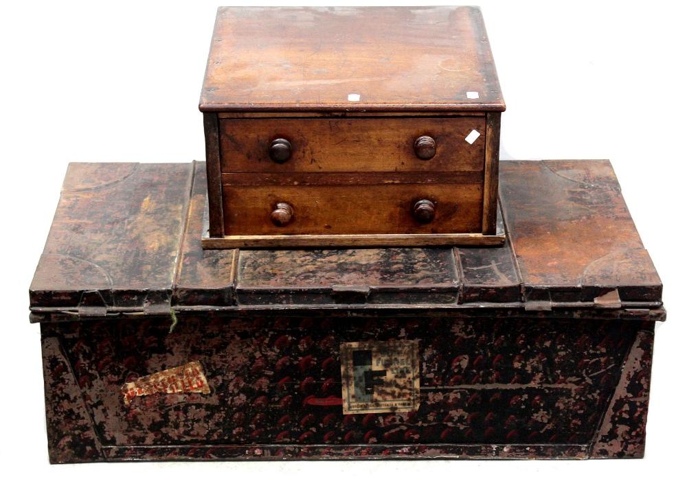 Lot 219 of 1098: An early 20th century tin uniform trunk with travel labels for 'Blue Funnel Line' travelling to South Africa, Australia and the Far East, a cabin number label and a French Marseilles label, Singapore etc and an early 20th century mahogany two-drawer office chest, 24 x 45cm (2).