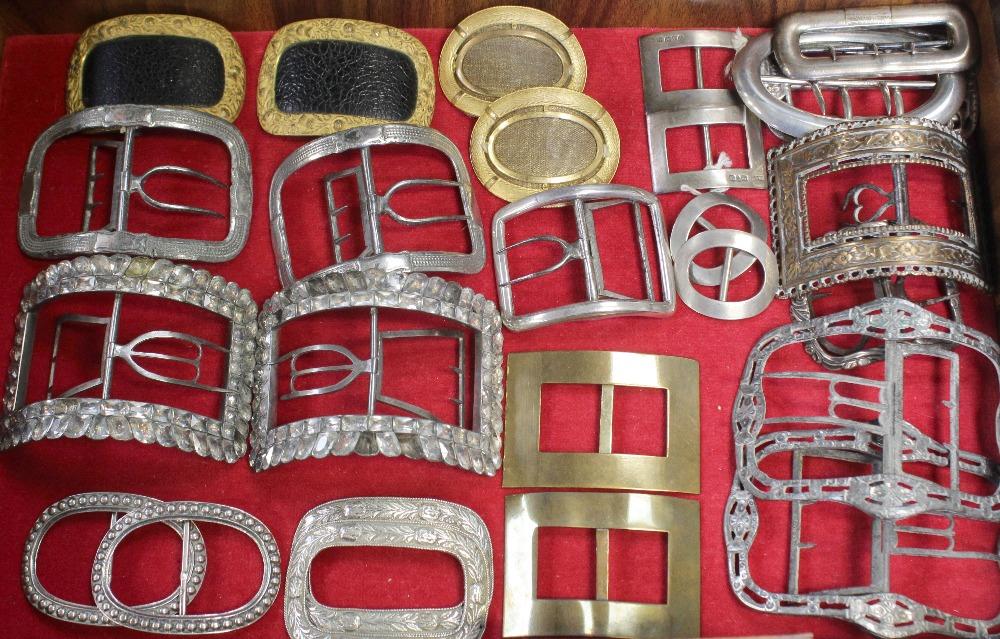 Lot 222 of 1098: A collection of 18th and early 19th century belt and shoe buckles to include hallmarked silver belt and shoe buckle examples, various hallmarks, early 19th century leather shoe buckles with metal surround decorated with thistles, diamanté belt buckles etc.