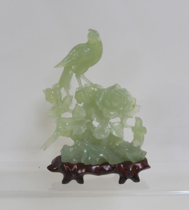 Lot 224 of 1098: A jadeite carving on stand of an Asiatic pheasant on naturalistic rock and peony base, overall height 20.5cm (af).