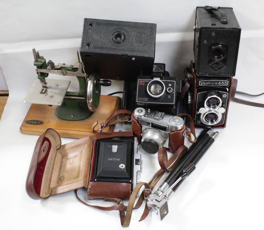 Lot 226 of 1098: A quantity of vintage cameras to include a Braun Paxette 35mm camera, a Nettar 66 bellows camera with Zeiss Ikon lens, Polaroid Colorpack 82, Box Brownie cameras, a Yashica 635 twin-lens reflex camera in brown leather case, assorted camera accessories and a miniature sewing machine.