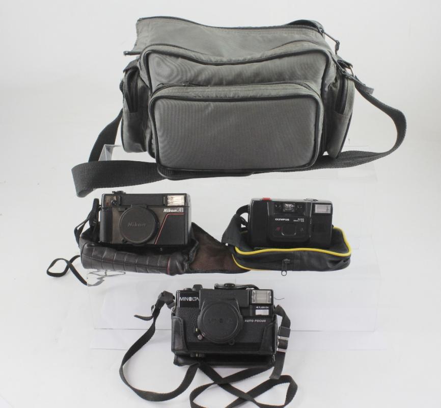 Lot 227 of 1098: A selection of vintage and later camera equipment to include a Minolta Hi-Matic AF2, an Olympus Trip AF 35mm camera and a Nikon L35 Autofocus, all in associated camera bag (3).