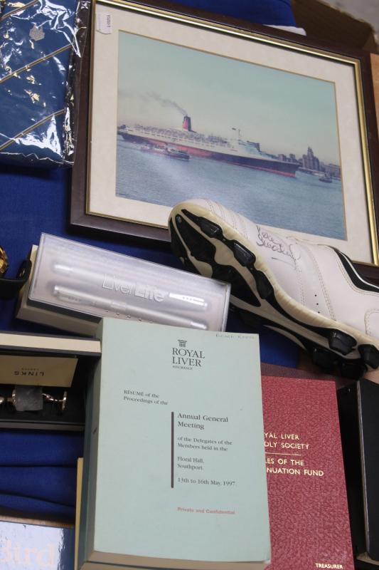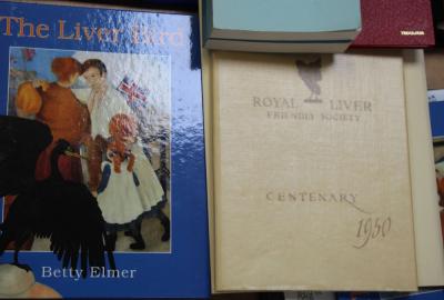 Lot 230 of 1098: A collection of memorabilia and ephemera relating to the Royal Liver Assurance Company, once housed in the Liver Building, Liverpool, to include B McCall 'Rule Book', two copies of Betty Elmer 'The Liver Bird', a children's book, Frank Green; watercolour 'The Bass House, the Royal Standard, the Hippodrome, the two Gregson's Wells Pubs', 9 x 40cm, framed and glazed, an engraving of 'Liverpool New Baths', a pair of Links of London hallmarked silver commemorative cufflinks with engraved image of th