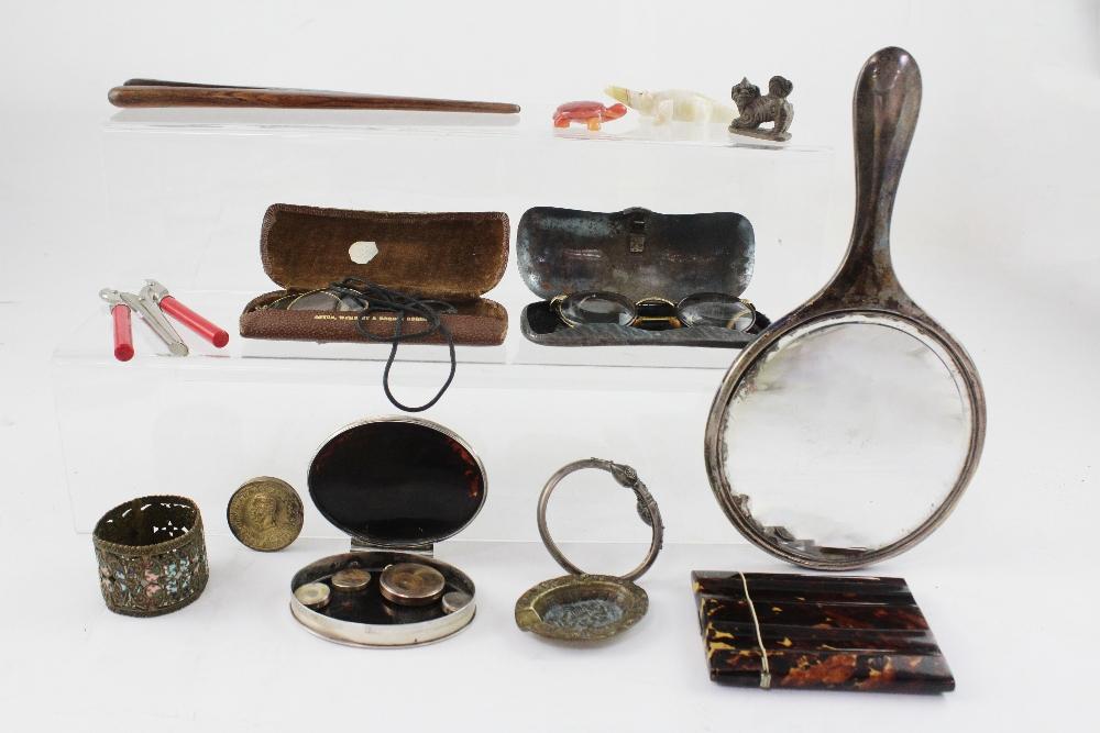 Lot 235 of 1098: A collectors' lot to include a nickel-mounted tortoiseshell card case, a tortoiseshell silver and mother of pearl inlaid snuff box decorated with animals, birds, stylised acanthus and a vase of flowers surmounted by a figure, width 8.5cm, a George V silver and tortoiseshell hand mirror, Birmingham 1926, a pair of early/mid-20th century folding hair curling tongs, an agate tortoise and crocodile, a small brass ashtray, a balm pot, a napkin ring as a souvenir of Venice, a silver crossover bracelet