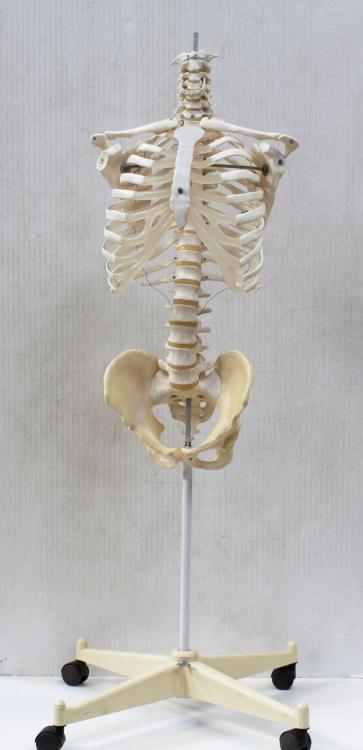 Lot 253 of 1098: A medical anatomical model of the human skeleton on base support with castors, length 104cm.