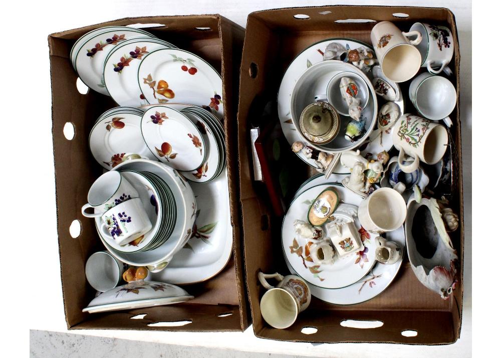 Lot 260 of 1098: A quantity of Royal Worcester Evesham Vale dinner and teaware to include large platter, tureen, dinner plates, side plates, cups, saucers etc, a small quantity of other items to include Hummel figurines, a Beswick blue tit no.992, and a quantity of crested ware to include St Helens jug, Llandudno cheese dish, Chester frog etc.