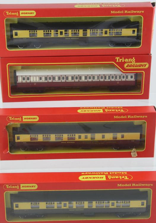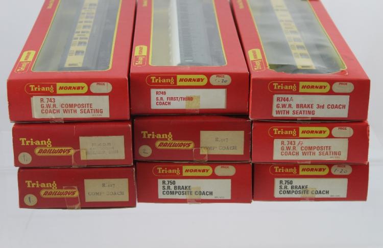 Lot 770 of 1098: A collection of Tri-ang Hornby OO gauge model railways carriages to include R428 Caledonian Brake/Comp Coach, two R247 Comp Coaches, two R750S.R. Brake Composite Coaches, an R749 S.R. First/Third Coach, an R744A GWR Brake Third Coach with seating, an R734A GWR Composite Coach with seating, an R743 GWR Composite Coach with seating, all in original packaging (9).