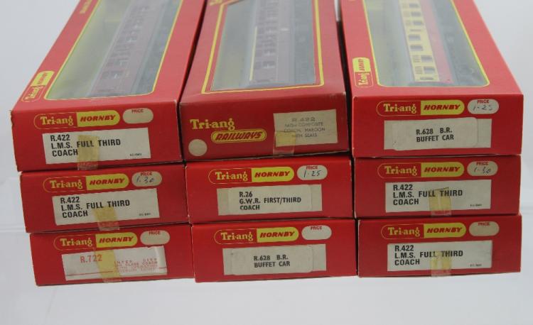 Lot 771 of 1098: A collection of Tri-ang Hornby OO gauge model railways carriages including four R422 LMS Full Third Coaches, two R628 B.R. Buffet Cars, an R422 First/Second Composite Coach maroon with seats, an R26 G.W.R. First/Third Coach, an R722 Intercity Second Class Coach, all in original packaging (9).