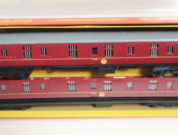 Lot 778 of 1098: A Tri-ang Railways R387 pair of full parcels brake coaches in maroon livery, R861 B.R. 2-10-0 locomotive 'Evening Star' and a Tri-ang Hornby R259S 'Oliver Cromwell' Britannia Class locomotive and tender, all in original boxes (3).