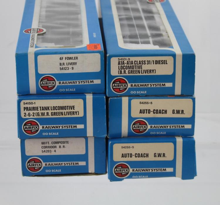 Lot 796 of 1098: A collection of Airfix Railway System OO gauge locomotives and carriages to include a Prairie Tank Locomotive 2-6-2 (GWR Green Livery), a 4F Fowler B.R. Livery, an A1A-A1A Class 31/1 Diesel Locomotive (B.R. Green Livery), two Autocoach GWR Carriages and a 60ft Composite Corridor British Rail Carriage, all in original blue packaging (6).