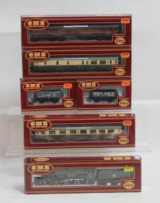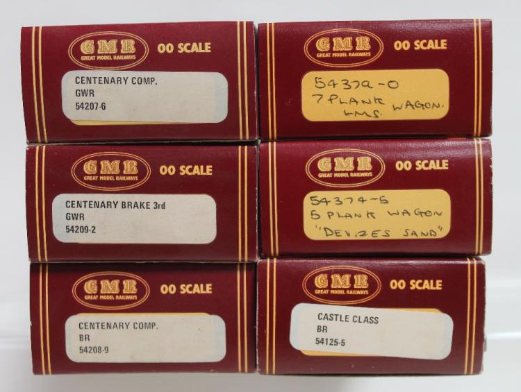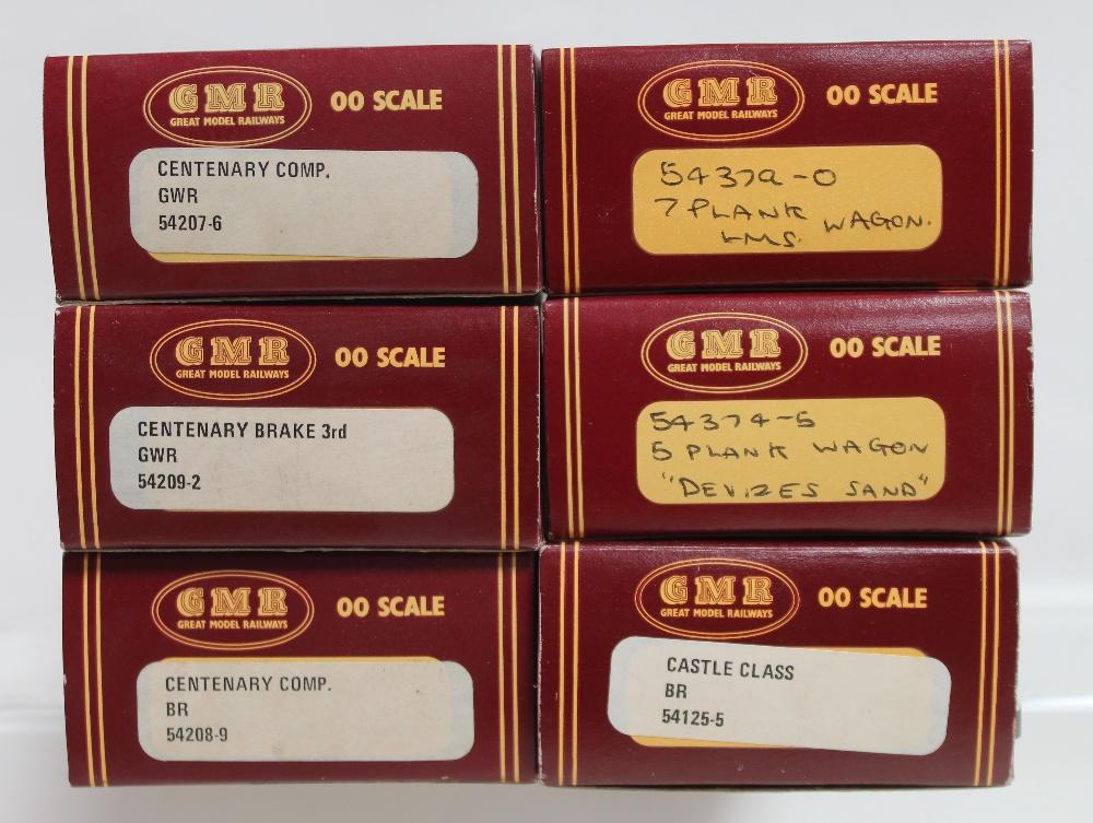Lot 798 of 1098: An Airfix GMR Centenary Comp. GWR 54207-6, a Centenary Brake Third GWR 54209-2, a Centenary Comp. BR 54208-9 and 54374-5 Five-Plank Wagon on Devizes Stand, 54379-0 Seven-Plank Wagon LMS livery and a Castle Class BR54125-5 loco and tender, all in original boxes (6).