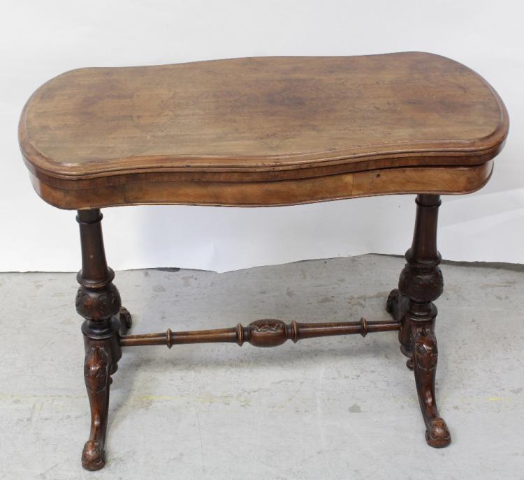 Lot 17 of 922: A Victorian walnut serpentine folding card table on twin-pillar base, carved with acanthus and united by a bar stretcher, length 90.5cm.