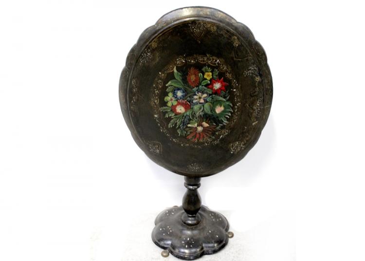 Lot 19 of 922: A Victorian papier mâché black painted oval table with hand-painted flora to the centre, with mother of pearl decoration, gilt-heightened throughout, to a turned pedestal base, on a circular floral shaped stand to three small brass feet, length 74cm.
