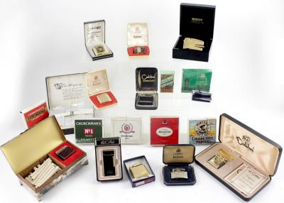 Lot 135 of 922: A large collection of tobacciana to include a quantity of cased and loose cigarette lighters to include Ronson, Veraflame, Ronson for H Samuel, various Colibri examples, a Jack Daniels commemorative lighter, two boxed S Dupont Paris lighters, a cased Yves Saint Laurent example, Stratton etc and a plated engine-turned cigarette box with tortoiseshell-effect lighter and a quantity of Churchman's Top Score cigarettes, unopened packets of named cigarettes to include Churchman's Number 1, Park Drive,