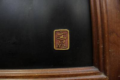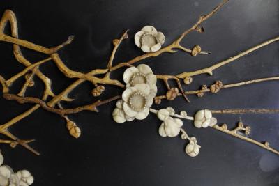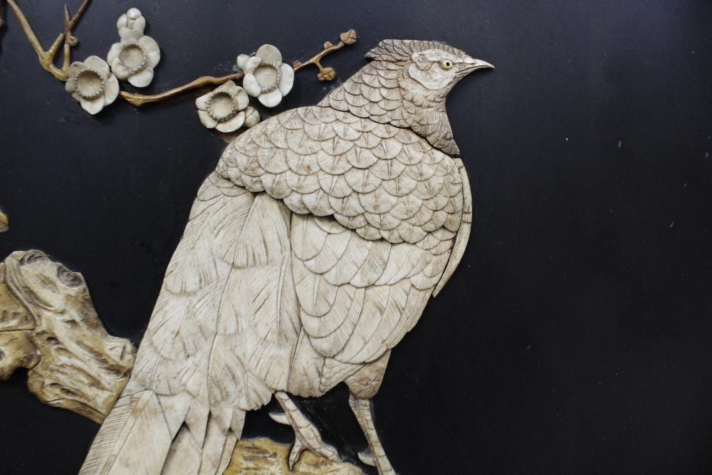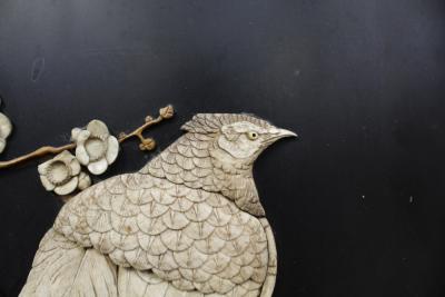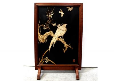 Lot 140 of 922: An early 19th century Japanese Shibayama panel in the form of an oak-framed fire screen with bird and prunus decoration, seal mark lower right-hand corner, approx 80cm.