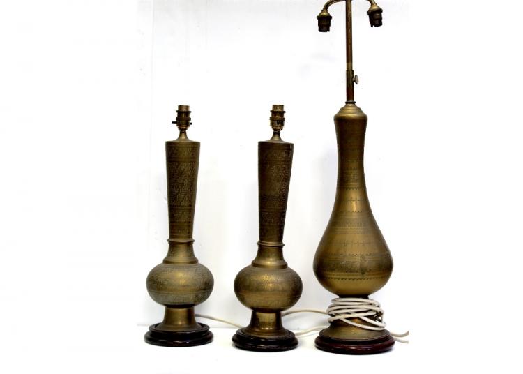 Lot 153 of 922: An Eastern brass adjustable electric table lamp, height 78cm with two similar flanking brass gourd lamps (3).