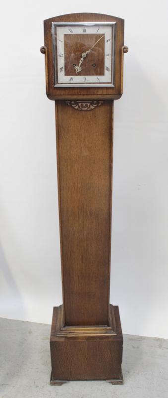 Lot 162 of 922: A 1930s oak cottage longcase cloak, the silvered square chapter ring set with Roman numerals, driven by a twin-train movement striking on coiled rod, height 142cm.