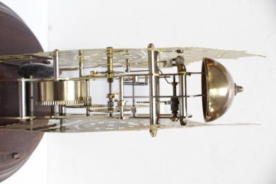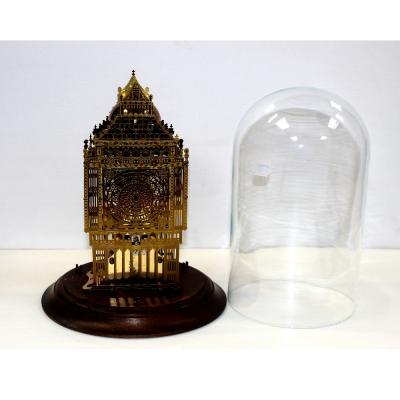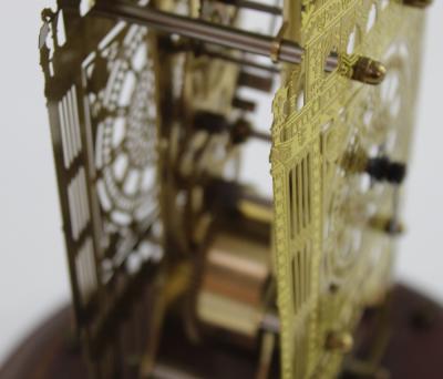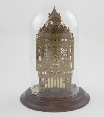 Lot 163 of 922: A 20th century skeleton clock in the form of a Gothic building, in glass dome and stepped circular mahogany base, height 30cm.