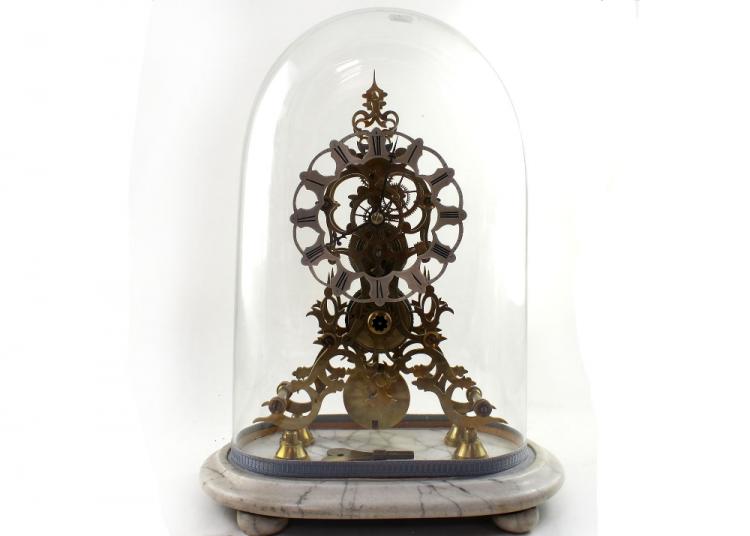 Lot 164 of 922: A large brass skeleton clock in the Gothic style, possibly Sewill of Liverpool, in glass dome to marble base with four bun supports, height 48cm.