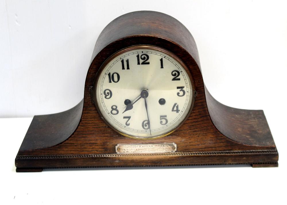 Lot 165 of 922: An early/mid-20th century oak-cased eight-day Napoleon hat clock, the silvered dial set with Arabic numerals, brass presentation plaque inscribed 'Presented to Edgar Coles... on the occasion of his marriage October 1929', height 24cm.