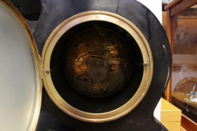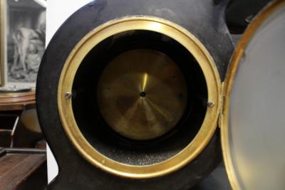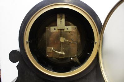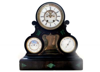 Lot 171 of 922: A 19th century black slate eight-day mantel clock with malachite inlay, the enamel dial set with Roman numerals, subsidiary dial with rolling day, date and month calendar and an aneroid barometer, the clock with a mercury compensated pendulum, height 59cm.