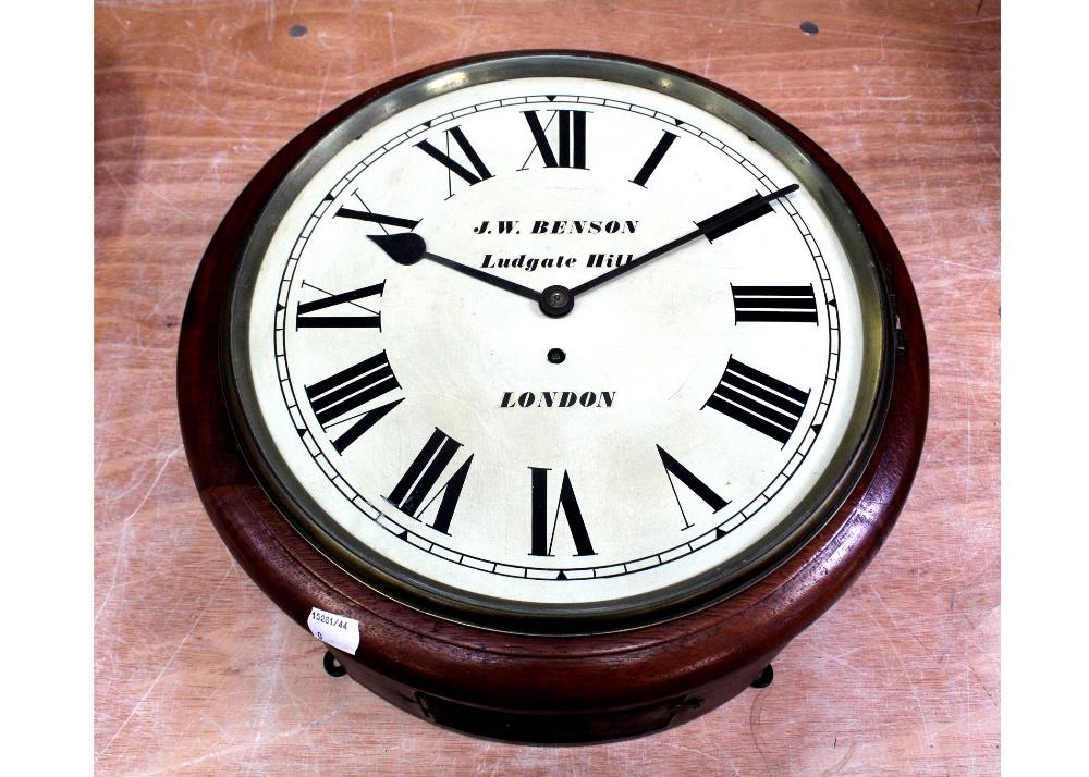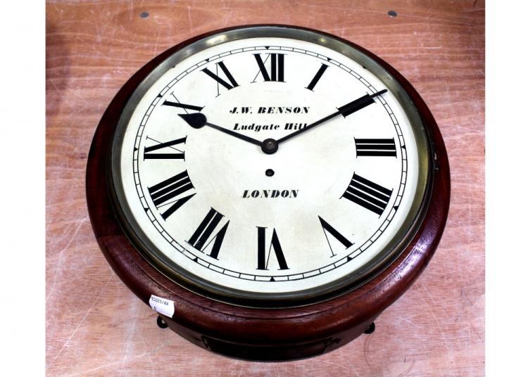 Lot 172 of 922: J W Benson, Ludgate Hill, London; a late 19th/early 20th century mahogany-cased station clock, the ceramic dial set with Roman numerals, diameter 38cm.